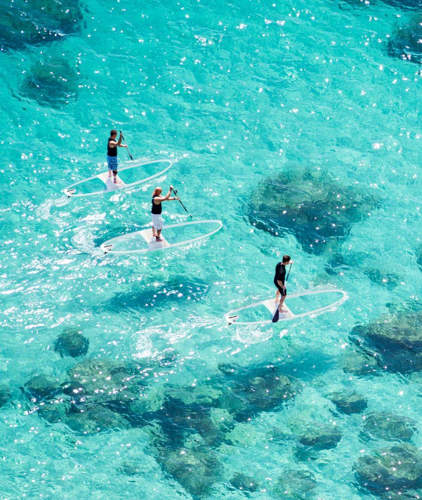 For the SUP connoisseur, French company Loeva has recently presented the ultimate board of choice. The Le Standup board is shaped like any other board, but it is built up out of shock and scratch-resistant acrylic glass both in the nose and the tail. The see-through parts are held together by an aeronautical carbon structure that keeps the weight down to around 20 kilos.