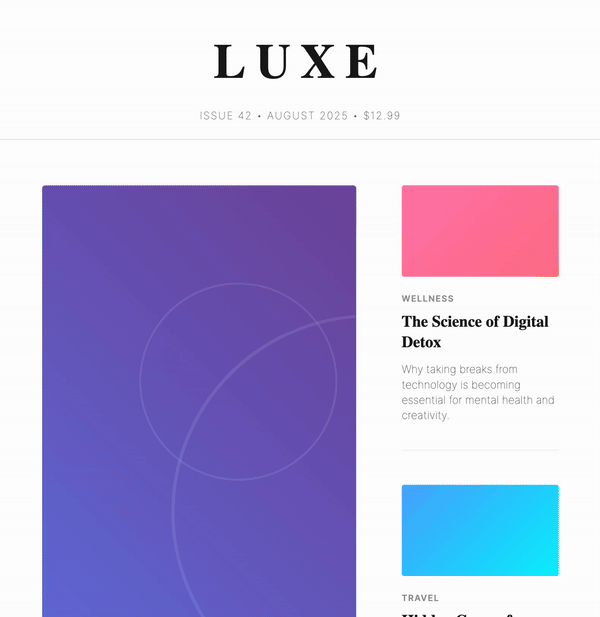 LUXE. (Seriously?)* In Bolt I used the ”enhance prompt” option and edited out the parts where it wanted to optimize for newsstands (confusion about the magazine concept again). Bolt provided reasoning and highly detailed rationale boosting its design decisions. The layout did not include any breakpoints for different screen sizes.
