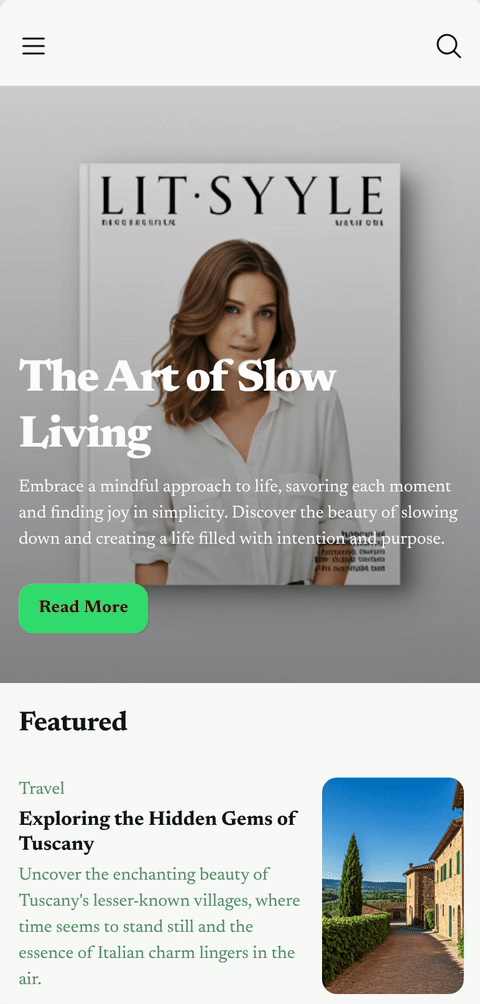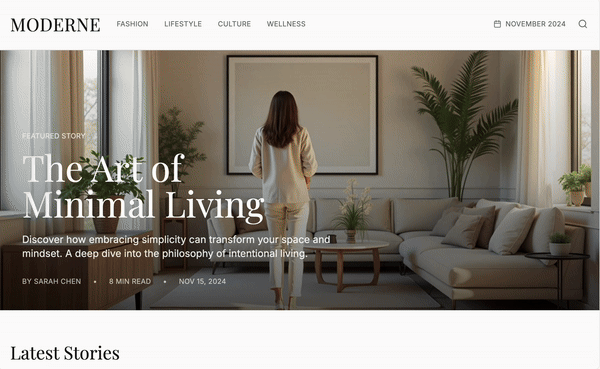 ”Lifestyle magazine front page with one hero story and several smaller ones. Clean, minimalistic layout. Sophisticated typography.”