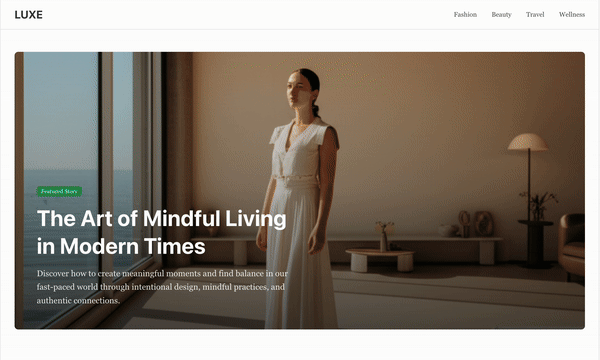 LUXE. Claude listed a design brief for review before executing on the prompt. After my green light, it whipped up an interesting solution with an extremely tall hero image. It showed real-time coding and provided a rationale for design decisions. There was no way of editing specific parts of the design outside of the chat and no intention of responsiveness.